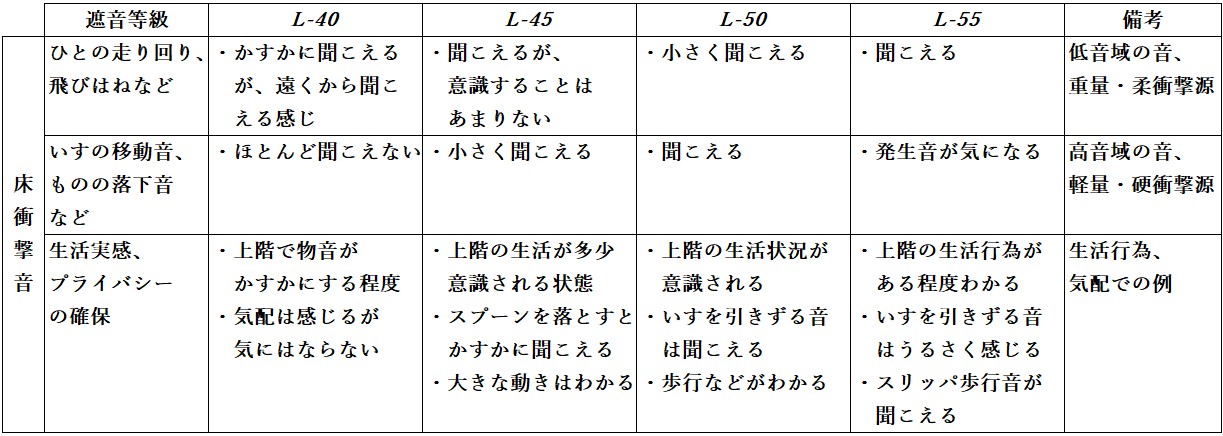日本建築学会における床衝撃音は、L値で表され、マンションなど集合住宅の設計基準として用いられています。 L値は、音が階下でどの程度に聞こえるのかの指標で、音の伝わりにくさを表しており、数字が小さいほど、遮音性能が優れていることを示します。