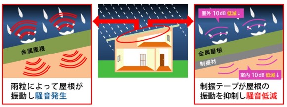 当社の制振テープは金属屋根の振動を瞬時に減衰・抑制し金属屋根から屋内外に発する雨音を低減します。
